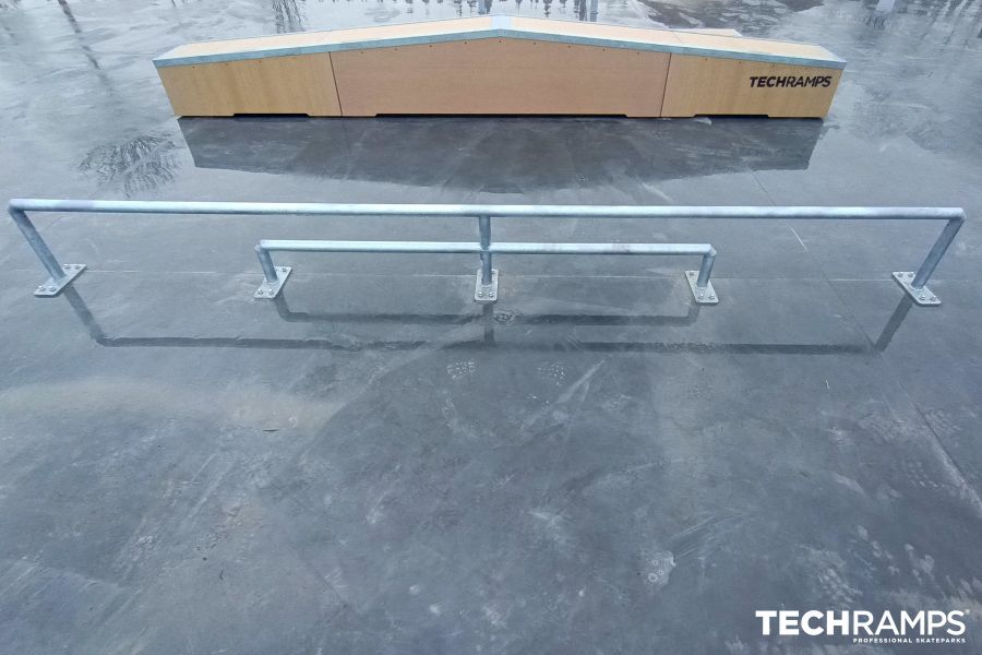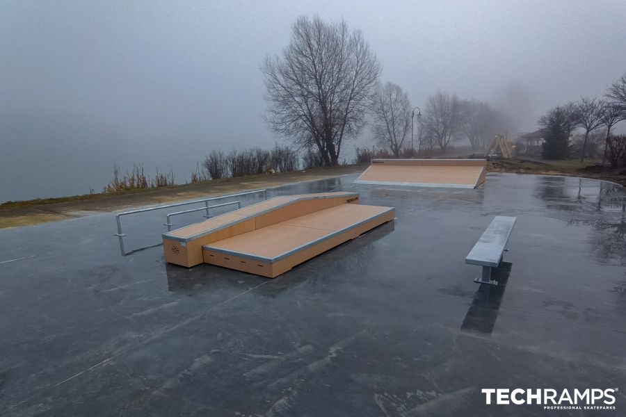 The Wolbrom facility, located at the Wolbrom Reservoir, is a compact set of modular obstacles using PRESTIGE technology designed for street riding. The layout includes a quarter pipe, several grindboxes and a straight handrail, allowing to perform a variety of tricks and build smooth lines of passage. An additional element is a bench providing a resting place for users. The structure is made of laminated plywood with a RampLine mat surface for durability and good rideability.