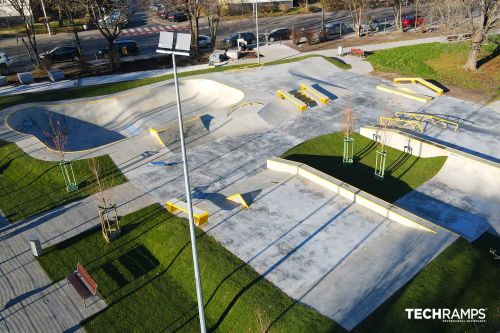 Zona street - oltre 780 m² con elementi piatti come due grindbox di diverse altezze, una serie di pad manuali, scale di diversi livelli di difficoltà, combinazioni di grindbox e corrimano, cordoli e piramidi in diverse varianti. Bowl - oltre 280 m² con una bowl profonda 150...