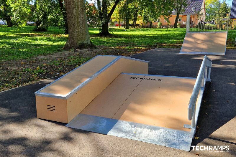 Elementi skatepark: Rampa di banca 1 360x244x120 Funbox con Grindbox 420x244x45 + corrimano Quarter Pipe 300x244x120 Grindbox 1 + Grindbox 2 486x181x25/50 Corrimano diritto 1 400x5x35
