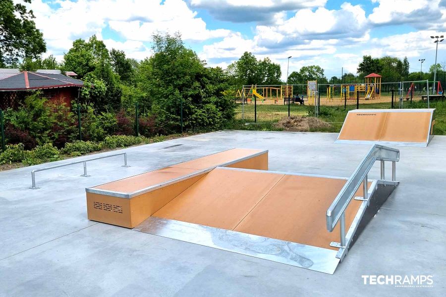 Elementi skatepark: Rampa di banca 306x244x90 Quarter Pipe 250x244x90 Funbox + binario per disastri + grindbox 420x324x40/45 Corrimano diritto piccolo 256x5x35