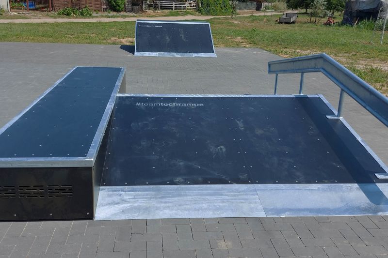 Elementi skatepark: Rampa della banca - 306x244x90 Tubo di quarto - 250x244x90 Funbox + binario di disastro + grindbox - 420x324x45 Corrimano diritto piccolo - 256x5x40