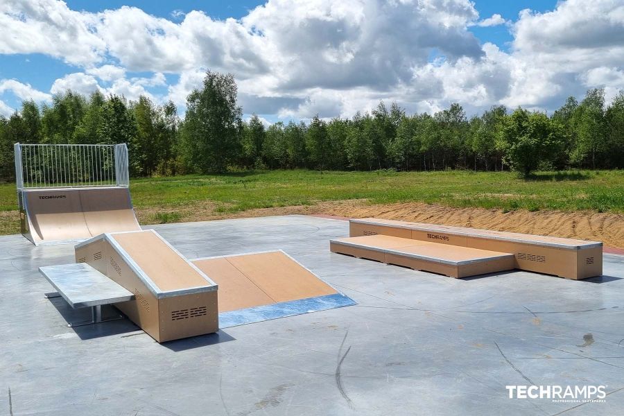 Elementi skatepark: Quarter Pipe 300x244x120 Rampa di banca 360x244x120 Funbox con Grindbox + Panca 2 420x304x35/45 Grinbox 1 + Grindbox 2 600x177x25/50