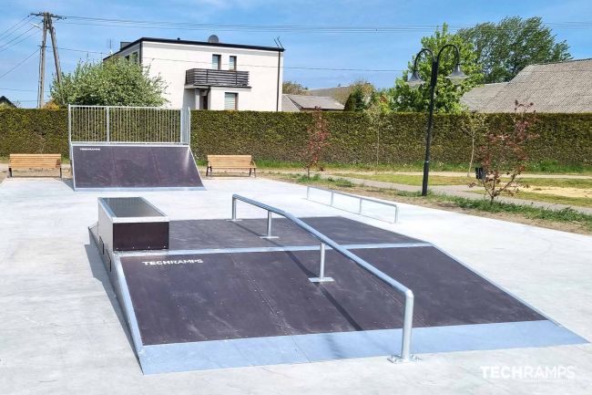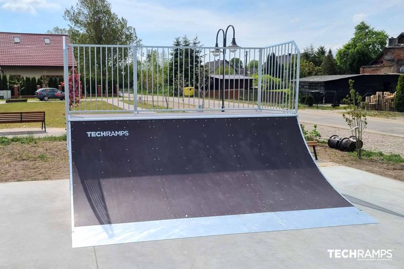 Elementi skatepark: Quarter Pipe 300x366x120 Grindbox 1 366x121x25 Funbox+grinbox 1/3 + corrimano 2/3 638x366x40 Corrimano diritto 400x5x35 Rampa di banca 360x366x120