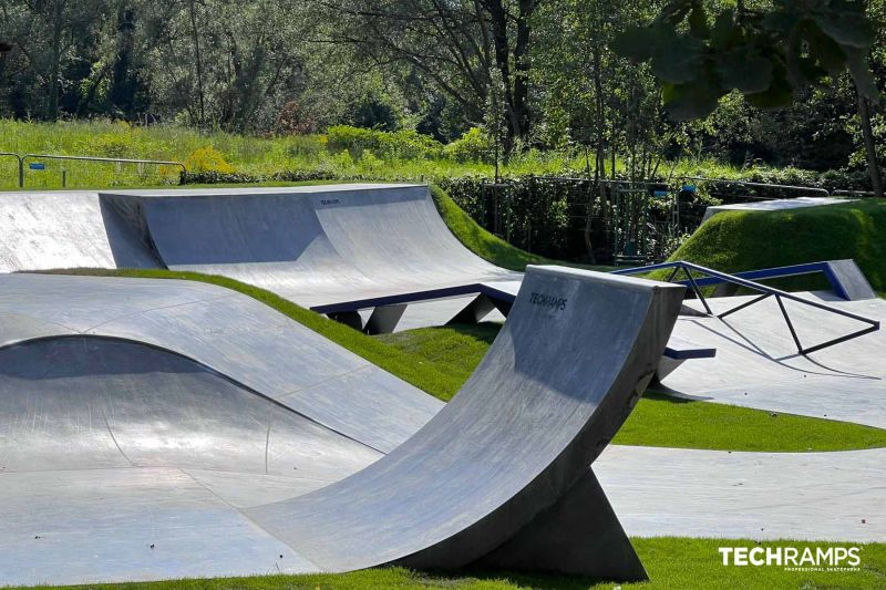 Скејтпаркот има необична форма, дополнително е интегриран во зеленилото.
