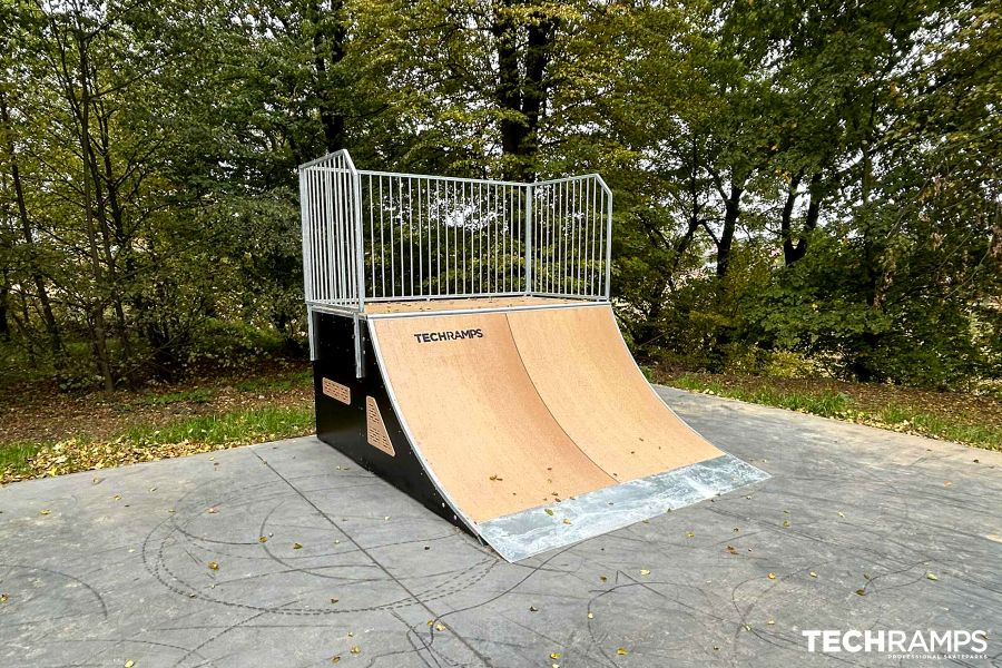 Elementy skateparku: – Quarter pipe – Funbox z poręczą 3/1 + grindbox (2 poziomy) – Bank ramp – Poręcz prosta